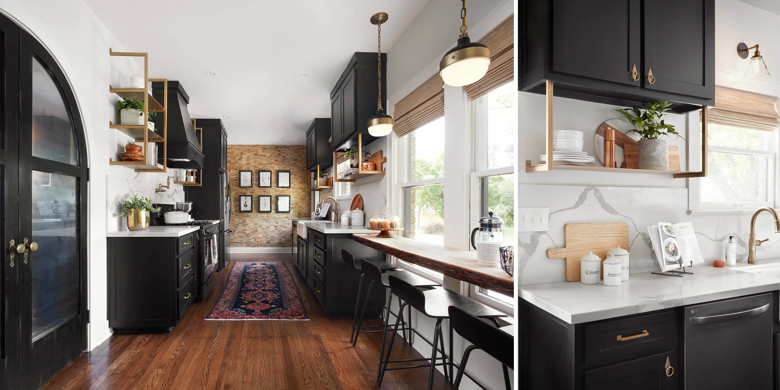 These custom L-brackets in Jo’s laundry room were built and powder coated by a local welder, and then attached to custom cut pieces of white oak wood. The brackets were mounted to wall studs prior to installation of the brick wall. If you’re up for building them yourself, you could easily purchase your own L-brackets from a hardware store and have wood shelving cut to your space requirements and liking!