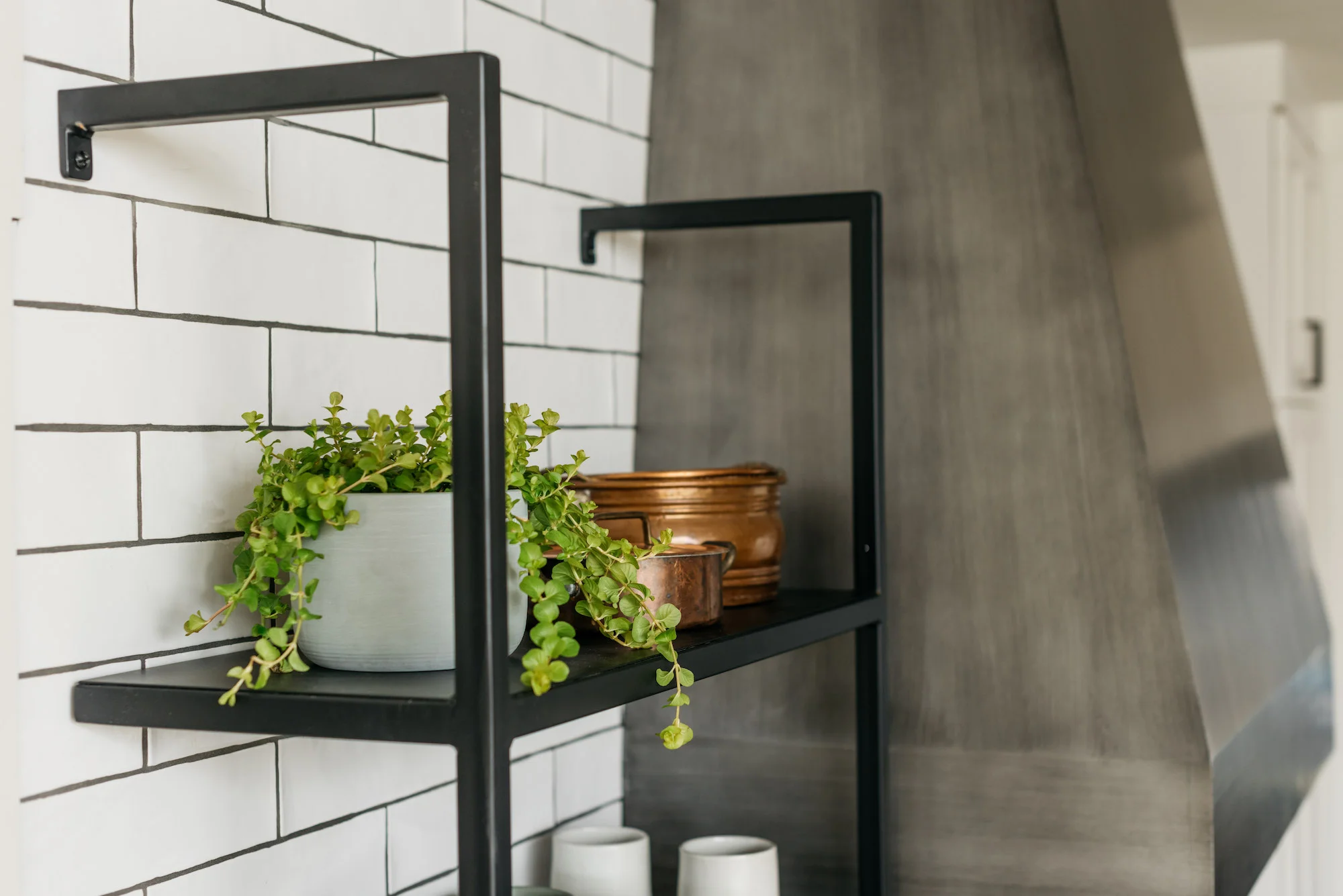 These custom shelves were built and powder coated by a local welder. This unit is installed far enough from the countertop to allow for plenty of workspace, but within reach to keep them functional for storing kitchen necessities. When styling these shelves, we suggest putting the more regularly used items on the lower shelves for easy access.