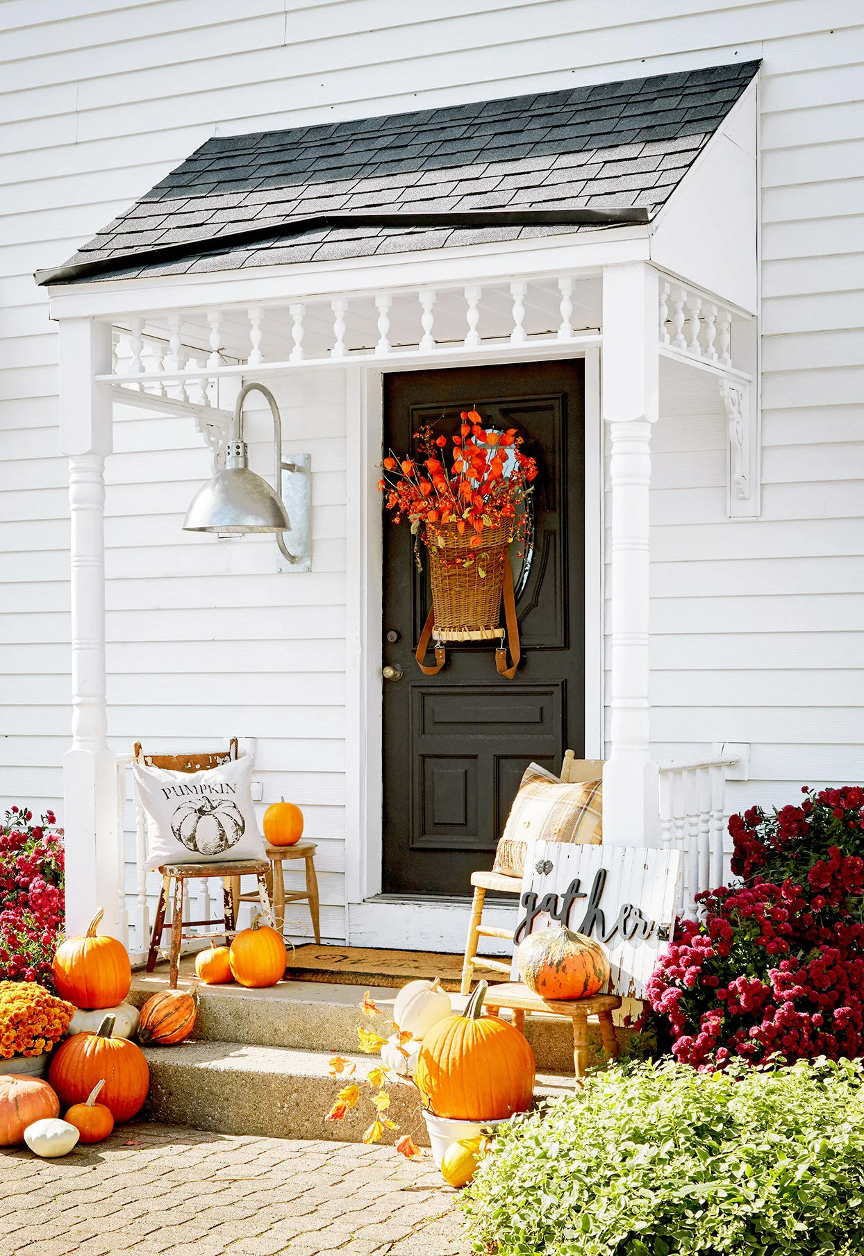 If you start with the right basic elements, you can easily update your front porch for fall with just one trip to the pumpkin patch. A pretty faux fall wreath makes a good investment you can reuse for years to come, and lanterns in varying sizes make versatile vessels you can switch up as the seasons change. For your autumn outdoor display, fill them with small pumpkins or fiery bittersweet branches and set a few larger pumpkins nearby for more fall color. Traditional fall porch decor such as pumpkins, rustic lanterns, and colorful wreaths will never go out of style.